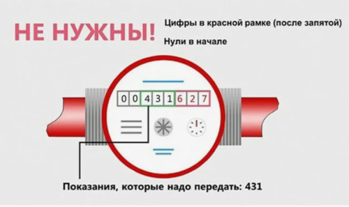 Аналогично с показаниями счетчика по эл. эн. Переписываете цифры до точки. Если у вас двухтарифный счетчик, то показания будут выглядеть так: