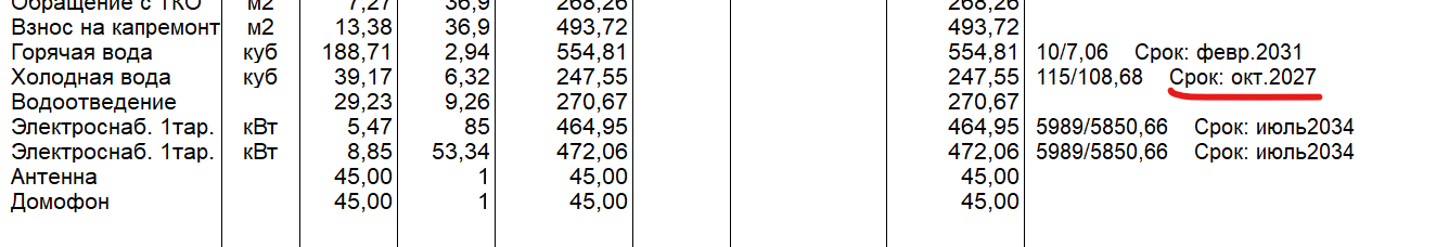 Сроки поверки для информации отображаются также в квитанции в колонке "Показания счетчиков" (см. рисунок ниже).